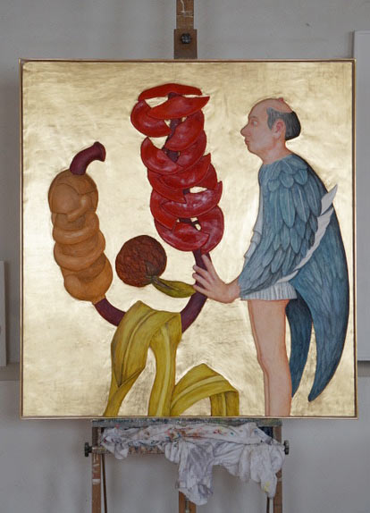 Josef Kern, „Der Bestäuber“ 2019, Lindenholz geschnitzt und gefaßt, 109 x 102 cm